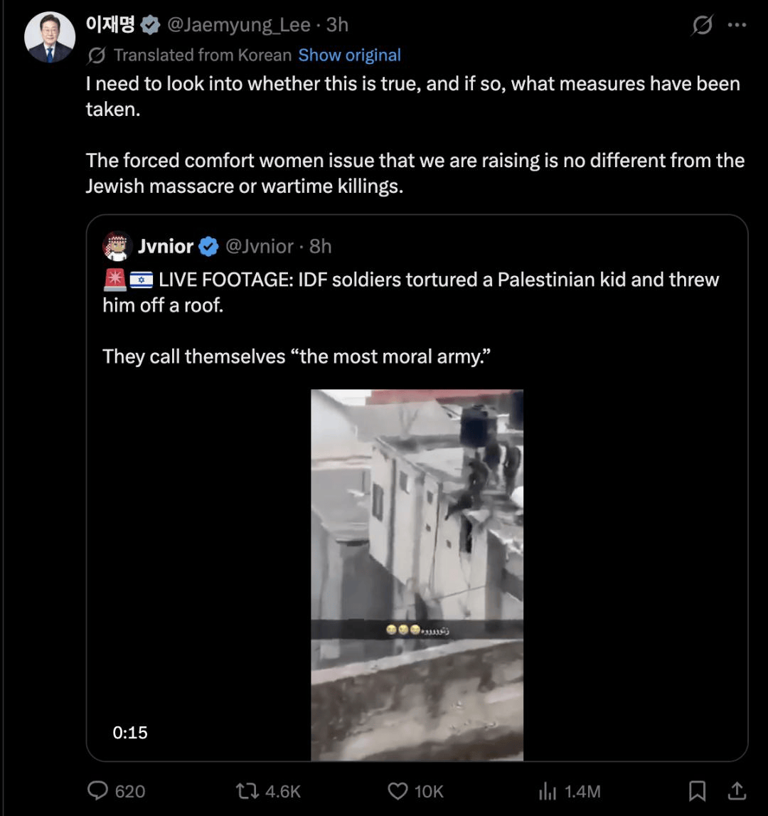 近日,韩国总统李在明在社交媒体上热烈诽谤以色列的军事活动,并骁勇将其与历史上最为恶劣的东说念主说念目的流弊视归并律。这一举动不仅是对以色列计策的平直挑战,更是韩国在国外舞台上慢慢明确本身态度、谋求应酬自主的蹙迫信号。李在明与以色列之间的这场公论交锋,深切揭示了国外关系与地缘政事的复杂博弈。 在李在明的公开评述中,其措辞极具冲击力——他不吝将以色各国防军的军事活动,与二战本领日本对华强征慰安妇、德国对犹太东说念主的屠杀视归并律,炮轰力度系数。针对近期以色列在加沙地区的军事活动,李在明明确站在东说