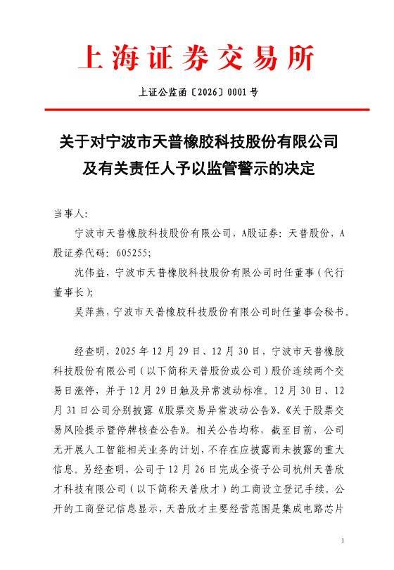 本年1月5日,上海证券来往所对天普股份及掂量职守东谈主发出监管警示函,函件文号为“上证公监函〔2026〕0001号”。