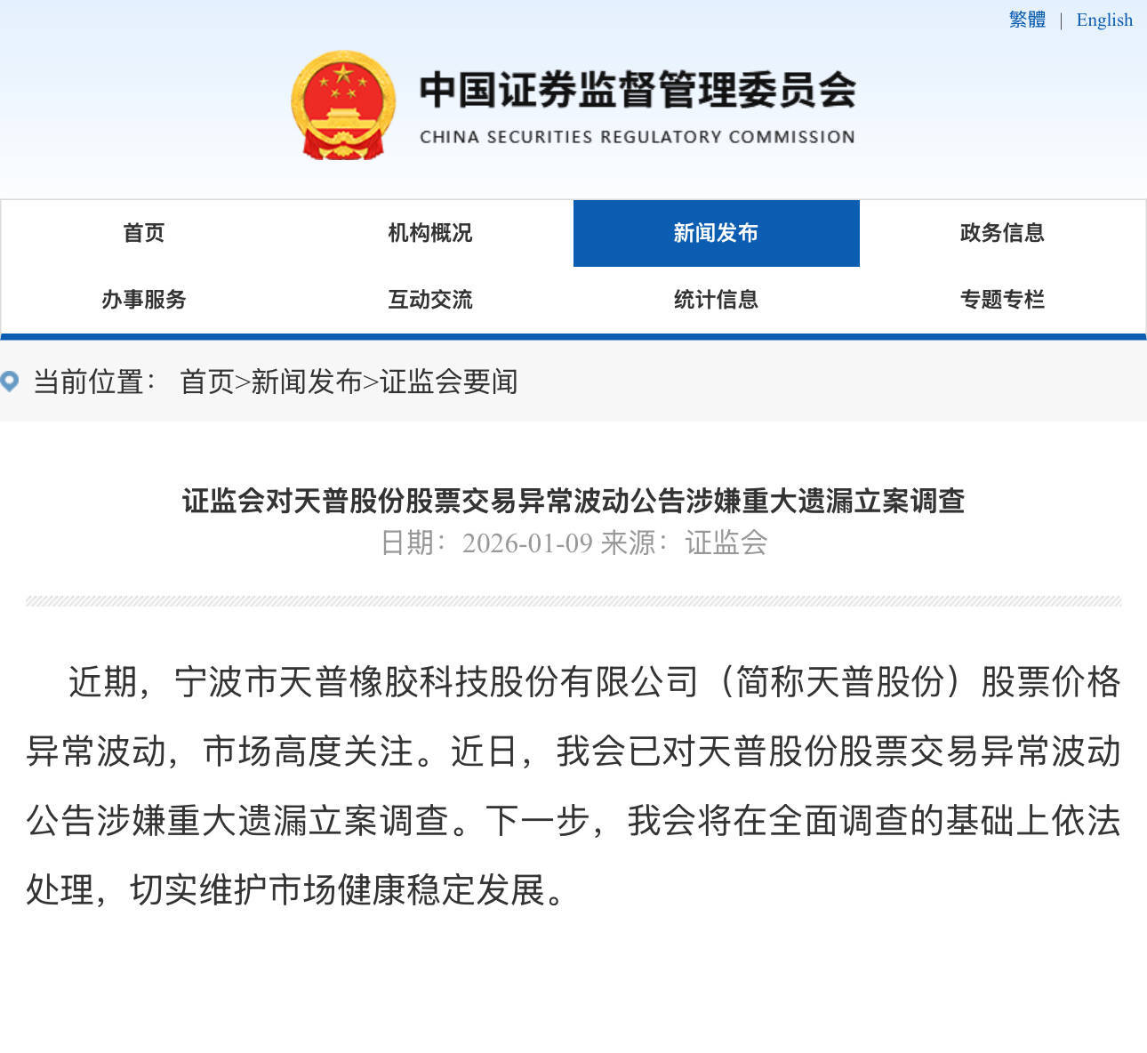1月9日,中国证监会发布音讯称,近期,宁波市天普橡胶科技股份有限公司(简称“天普股份”)股票价钱格外波动,市集高度关注。证监会于近日已对天普股份股票来往格外波动公告涉嫌首要遗漏立案探访。