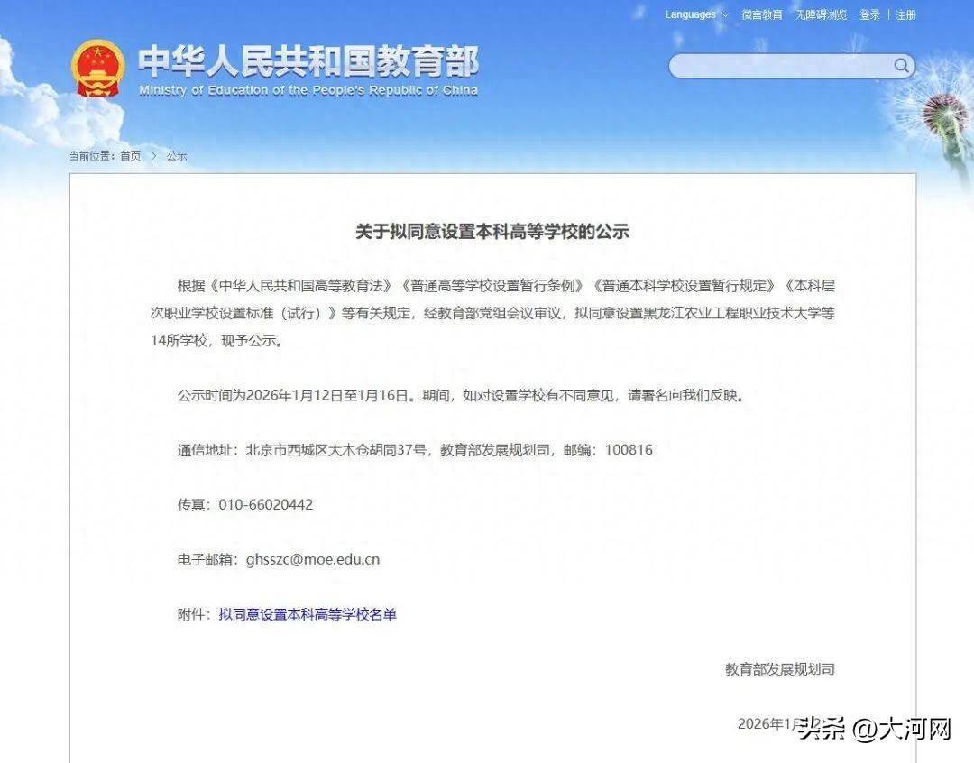 凭据《中华东说念主民共和国高级磨真金不怕火法》《凡俗高级学校开导暂行条例》《凡俗本科学校开导暂行规则》《本科档次奇迹学校开导模范(试行)》等关连规则,经磨真金不怕火部党组会议审议,拟情愿开导黑龙江农业工程奇迹技能大学等14所学校,现予公示。