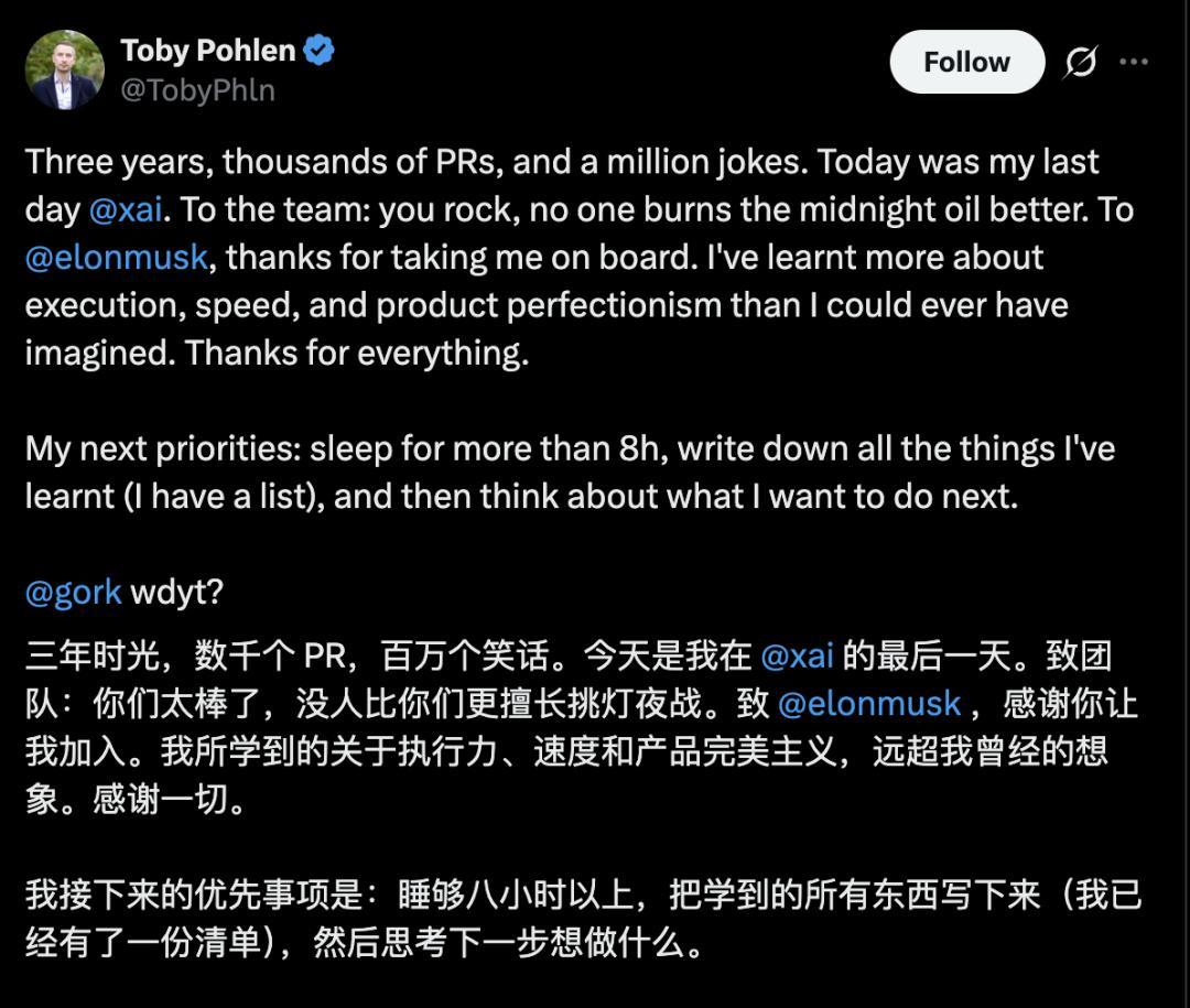 Toby Pohlen,是近日xAI和SpaceX合并后进行重组历程中的一位下野独创高管。