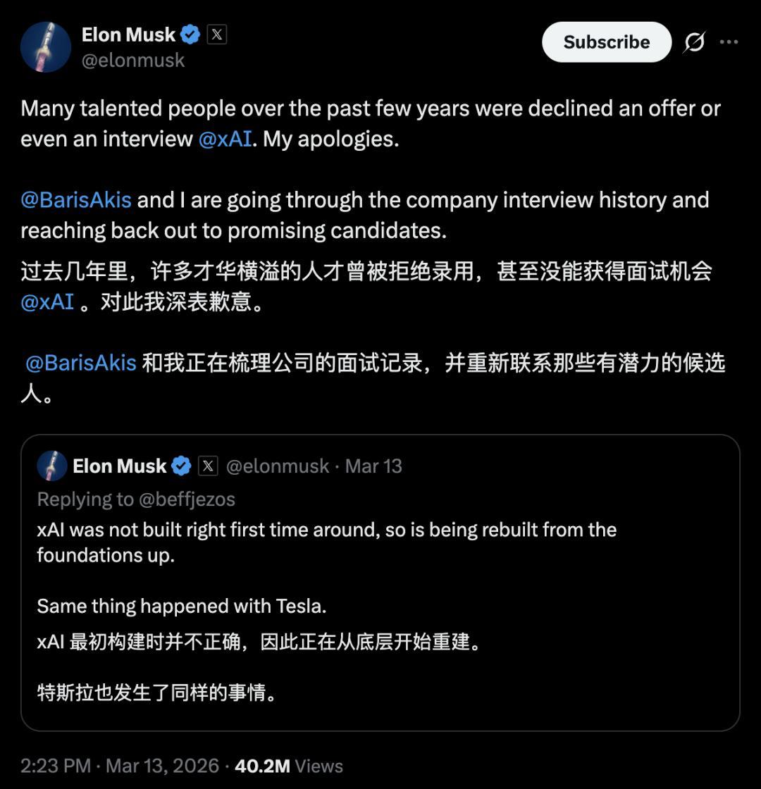 马斯克承认xAI「一启动就搭错了」,这个「认错」的时点有些好意思妙。