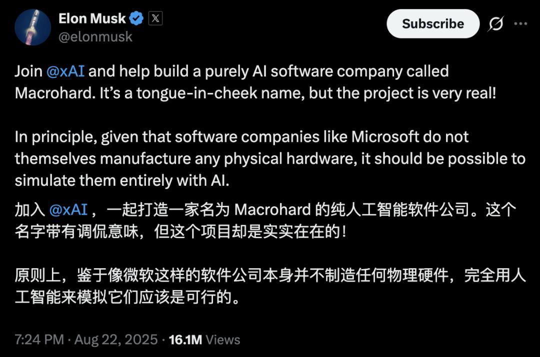 Macrohard是马斯克在2025年8月亲身晓谕的弘愿技俩,名字是对微软的公开嘲讽,想象是用AI智能体颠覆传统白领办公软件。